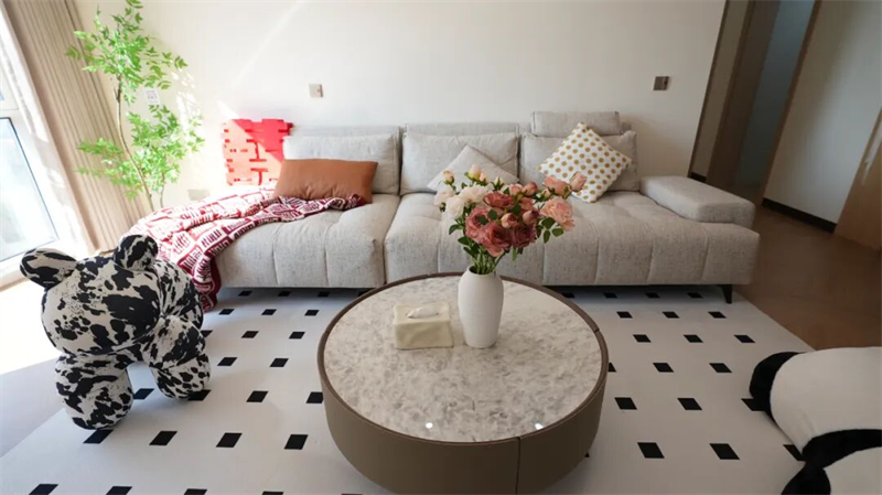 阳光透过纱帘洒落,点亮一室静谧,圆润茶几上一束玫瑰静静绽放,为空间注入自然的生机。黑白斑点小熊摆件与红色艺术靠垫巧妙点缀,增添几分童趣与活力。这里不仅是休憩的角落,更是生活与美学交织的温馨港湾——简约不简单,治愈每一刻的归心时光。