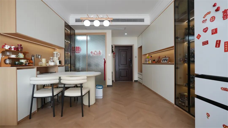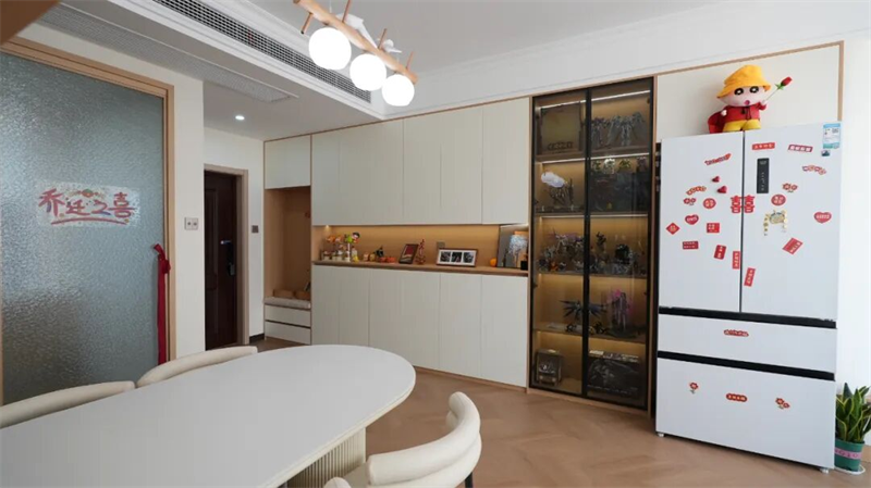原木奶油风的基调延续至餐厨区域,开放式餐边柜设计巧妙融合收纳与展示功能,暖光灯带点亮每一处细节,让日常用品也拥有诗意的陈列。圆润的白色餐桌搭配柔软坐垫椅,营造轻松围坐的温馨氛围;一旁冰箱贴满喜庆红标与可爱贴纸,洋溢着新居的喜悦与烟火气。