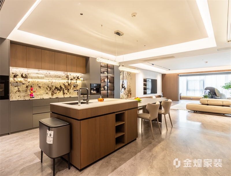 该设计以无主灯设计、岩板与木作结合,打造通透大气的现代轻奢大平层,兼具质感与生活温度。