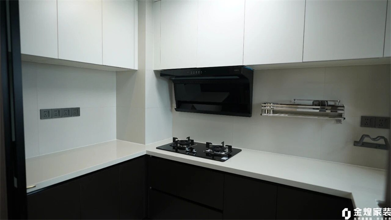 厨房整体采用黑白搭配,营造出整洁利落的视觉效果。U型布局让空间利用率最大化,操作流畅且方便。嵌入式的厨电设计进一步优化了空间,简约的设计不仅让厨房看起来明亮,也提升了烹饪时的舒适感。
