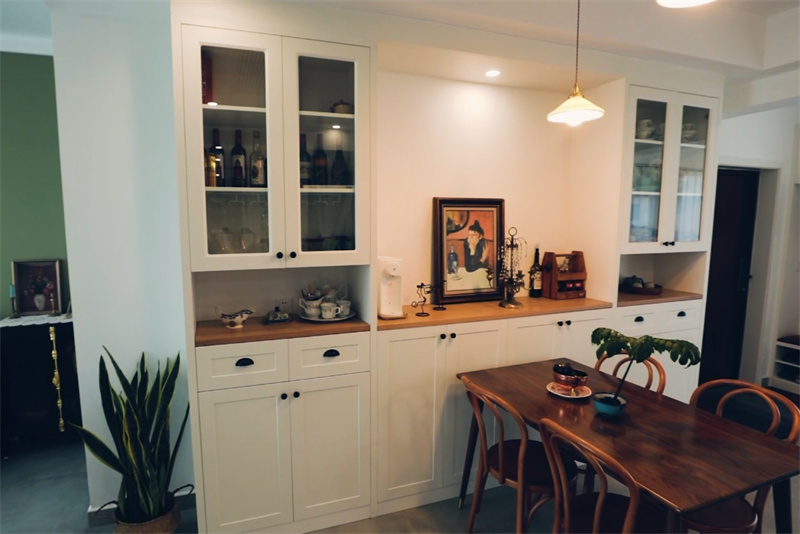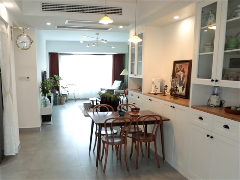 本案客餐厅以灰、白、果绿为主,自然、安静、舒适,整体硬装少而精,软装+绿植丰富整个空间,让房子生动起来,像植物园一样有生机,更让整个空间鲜活起来。每次回到家都是一次心灵的放松,沙发背景采用一组简约美观的装饰画,配上清新的绿植,点亮了空间的文艺与清新。