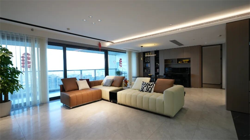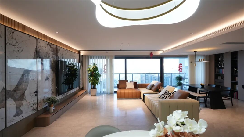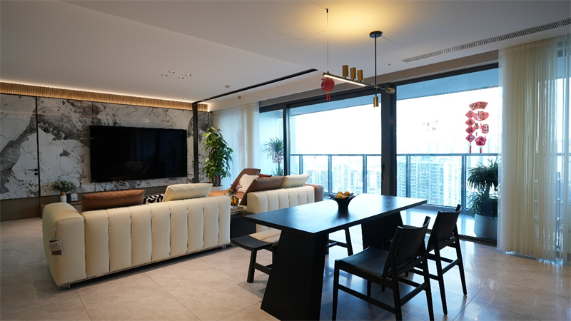 客厅,以开阔格局与精致细节彰显品质生活。大面积落地窗引入充足自然光,搭配通透纱帘,视野开阔,城市景观尽收眼底。电视背景墙采用天然大理石纹理饰面,结合木饰线条勾勒,层次丰富又不失高级感。