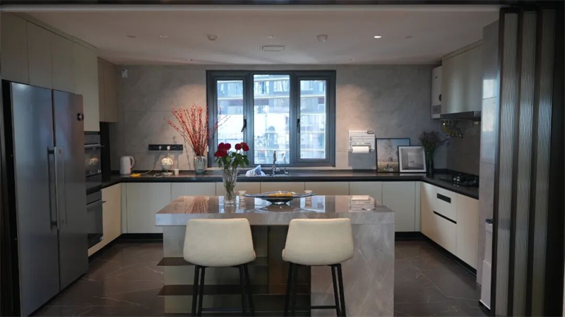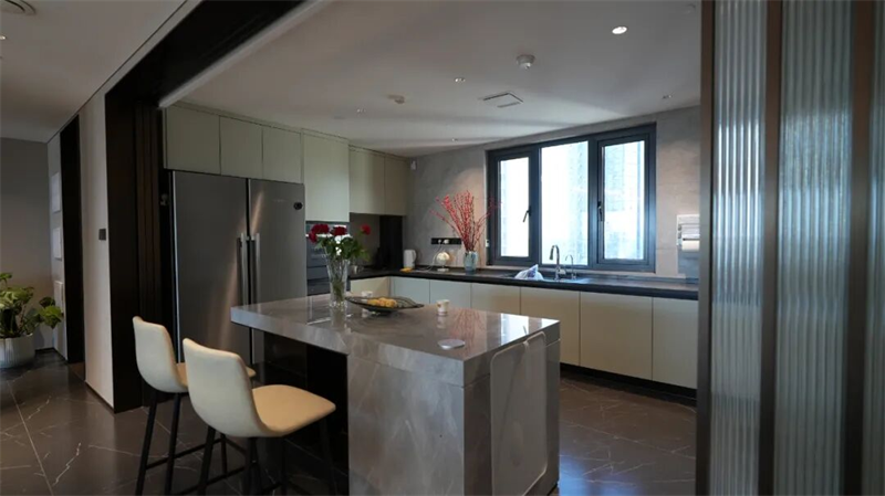 厨房浅色橱柜搭配黑色台面与灰色墙面,营造出干净利落的视觉效果。中央岛台采用大理石材质,兼具操作台与吧台功能。嵌入式冰箱、烤箱与洗碗机等高端家电一应俱全,布局合理,提升使用效率。绿植与花艺点缀其间,为空间增添生活气息,让下厨也成为一种享受。