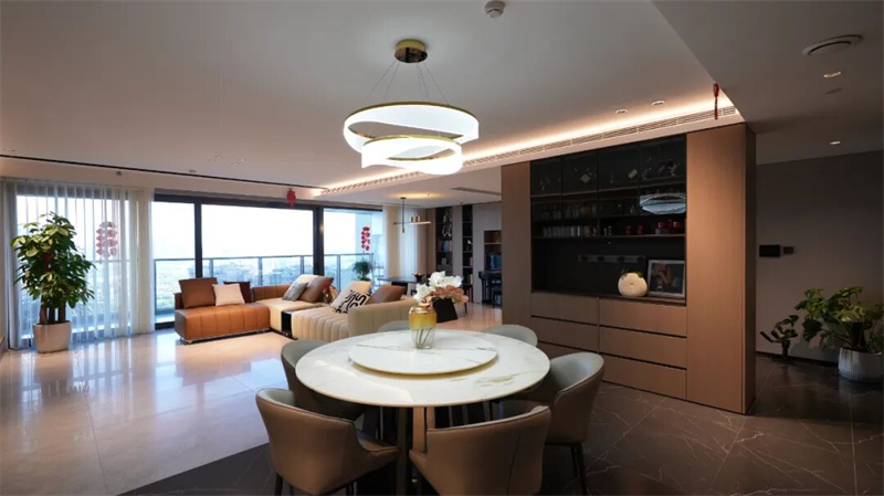 餐厅延续整体现代轻奢风格,圆形大理石餐桌搭配浅色皮质餐椅,简洁大气又不失温馨。地面采用深色大理石瓷砖,与浅色墙面形成对比,提升空间层次感。一侧整墙储物柜兼具酒柜与展示功能,玻璃门设计让藏品一目了然,实用又美观。