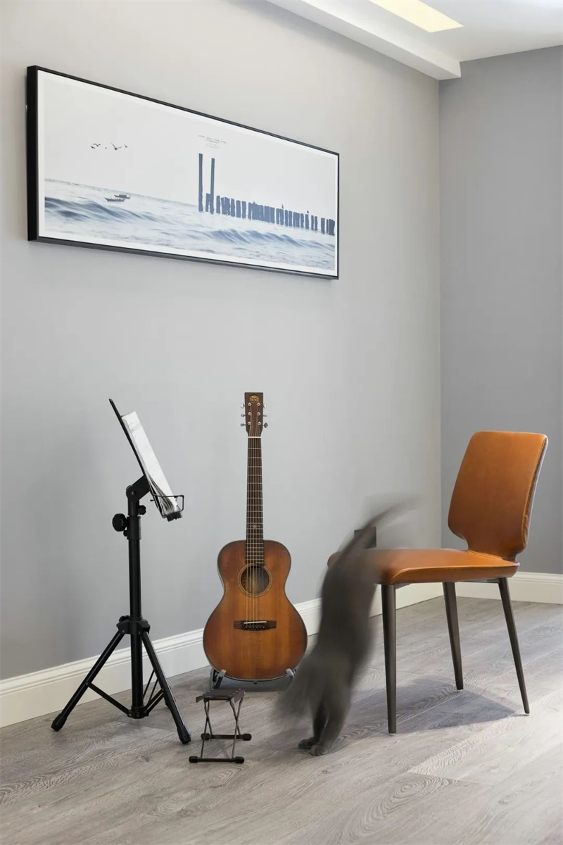 现代简约的书房注重实用性和整体协调性。纯白书桌和书架组合,打造出一个明快而整洁的学习空间。舒适的椅子、明亮的台灯以及一些简约的挂画与乐器装饰,让这个空间兼具工作与休闲的功能。