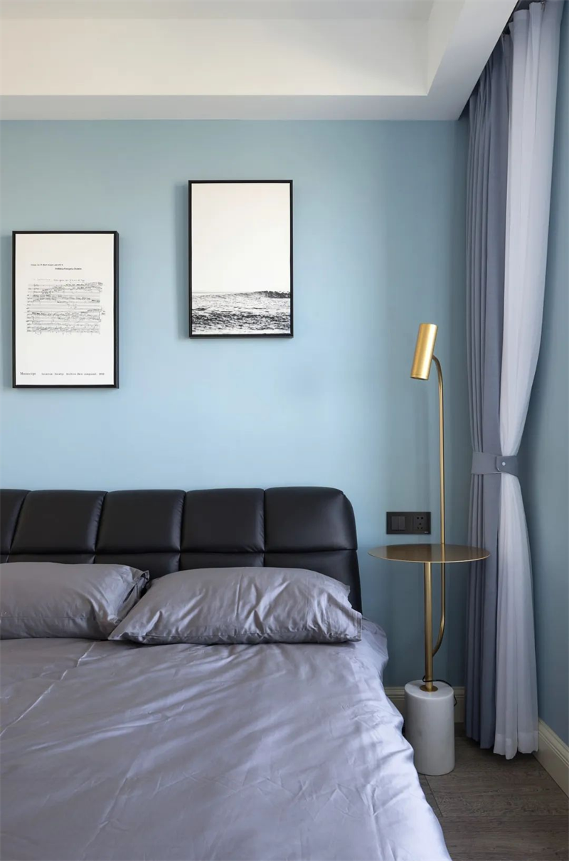 主卧采用了极简的设计语言,白色和浅灰色墙面搭配木色地板,突显整体空间的清新与宽敞感。床品选择了高质感的纯棉,搭配一些柔和的装饰枕,营造出温馨的氛围。简约的床头柜和灯具设计,为主人带来舒适轻松的睡眠空间。