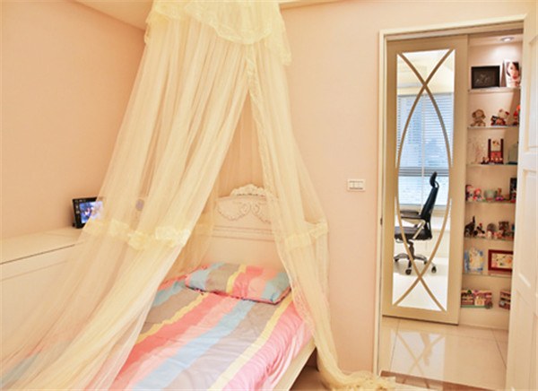 长沙装修公司设计在软件挑选上刻意以缤纷的彩色床单为画笔,搭配圆形蚊帐帷幕,薄纱轻舞间带出童话般的公主风情。