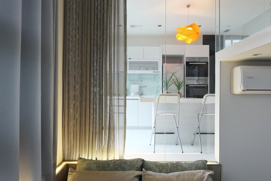 长沙家装首选金煌点评:在长沙装修业主的卧室与客厅的玻璃之间,为了保护私密性采用了拉帘,集装饰与隔断为一体。
