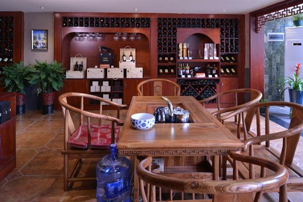 长沙装饰业主品味了的古淡静谧,我们再来看一下红酒陈列区的贵族风韵。红酒作为西方文化的典型代表,象征着一种高贵、有品位的生活方式,而西方设计界流传着这样一个观点:“没有中国元素,就没有贵气。”因此,装饰公司通过经典中国元素的调度,在中式风格端庄大气的框架内,表达优雅、高贵的红酒文明,是装修公司为商户和客户以设计之力奏出的华丽交响曲。红酒放置区,横跨整个墙面的实木酒架气场毕现。酒架里镶嵌着大大小小的格子间,或方正规整,或身段灵巧,每一格用厚实的板材清晰隔开,既方便客户观摩甄选,又给予每瓶红酒以足够的空间,以一目了然的呈现,侧面烘托着红酒品质的通透澄净。硕大的酒架上连天花板,下接地板,裸色和鎏金黄色分置天地两端,牢牢呼应着“天轻地重”的配色讲求,体现了装修方对细节的重视。