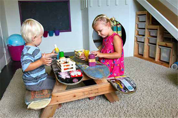 去掉轮子的滑板依旧坚实耐用,可以改装成桌椅,任孩子涂鸦玩耍。