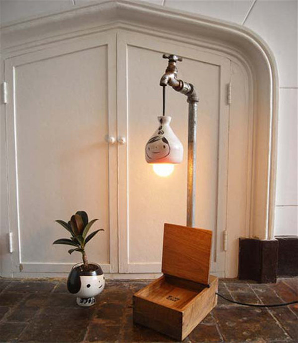 锈迹斑斑的旧水管经过改造,彻底改头换面,成为了独一无二的落地灯,再放一盆可爱绿植与之搭配,复古怀旧、可爱温馨之感迎面扑来。