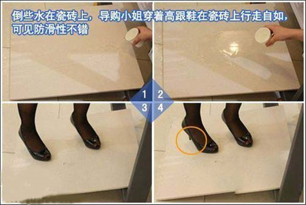在选购瓷砖的时候一定要做一下试水检测,可以在地上铺两片比较大的瓷砖,如果瓷砖表面有打蜡或者油纸的话需要提前去掉,然后在做试验,将水洒在瓷砖表面,然后穿着鞋子在上面来回走动,看看有没有滑动的感觉,如果有的话则说明瓷砖防滑性比较差。