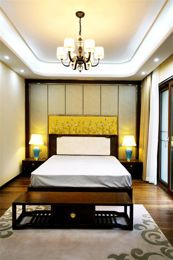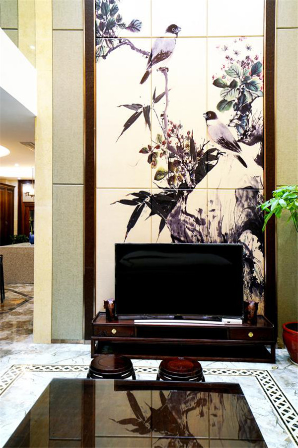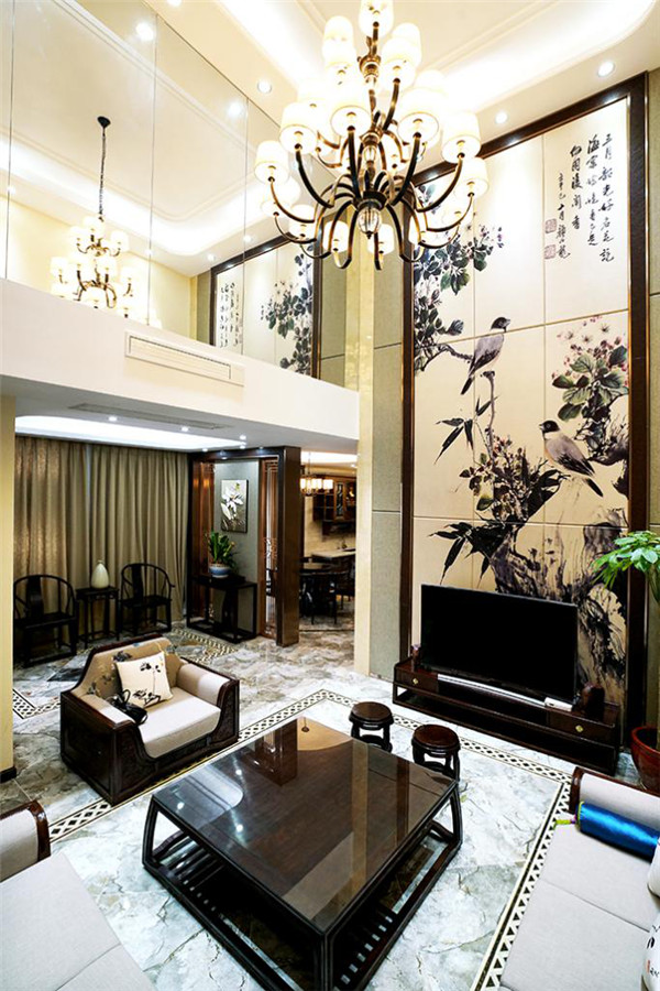 鸟语花香的水墨电视背景墙延展至二楼,开放的纵向空间保证了通透的宽敞感。深棕色的实木家具搭配着白大理石色地板,庄重而典雅。