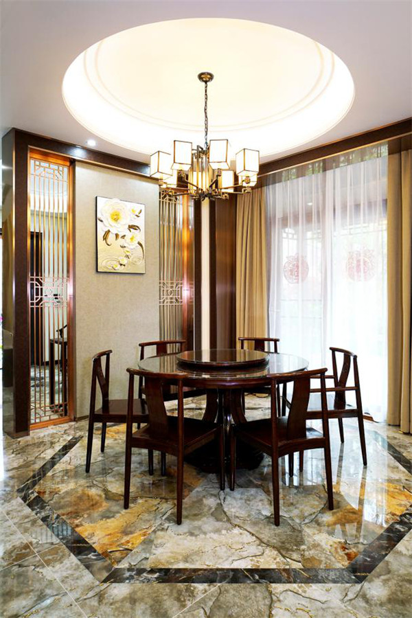 中国传统讲究天圆地方,在圆形吊顶和大理石地板利落流畅的线条上下呼应下,整个空间显得大气而和谐。通过垂感十足的薄纱帘,落地玻璃上的一对福字衔着远窗外的景致若隐若现,为沉稳用餐空间增添一抹浪漫诗意。