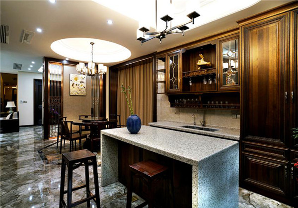 开放式厨房设计,默默的居于一隅诠释整个家居开阔大器的崭新风范。简单的富贵竹利落回应橱柜典雅沉稳的色泽,让日常的油盐酱醋也变得韵味十足。