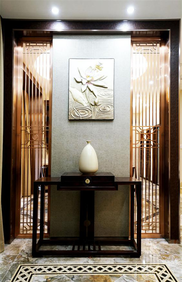 栩栩如生的浮雕莲花是整个玄关最亮眼的景致,寓意着家的吉祥如意。透空木格栅屏作隔断,既有古朴雅致的风韵,又能产生通透与隐隔的互补作用。