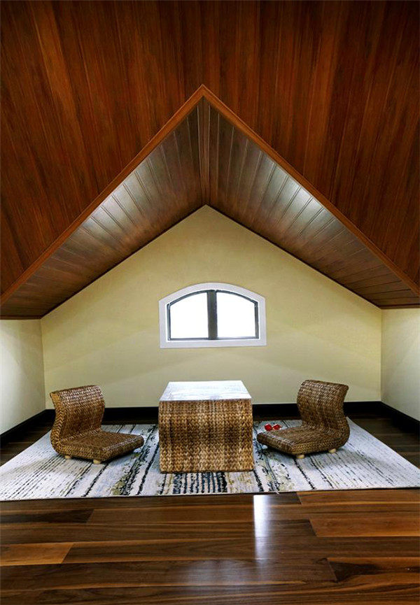 原木地板、草编椅靠、精致小巧玻璃窗、棱角分明的三角吊顶,简单、悠闲,繁简相宜,一方小小的茶室空间即满足了烹茶品读的悠闲时光。