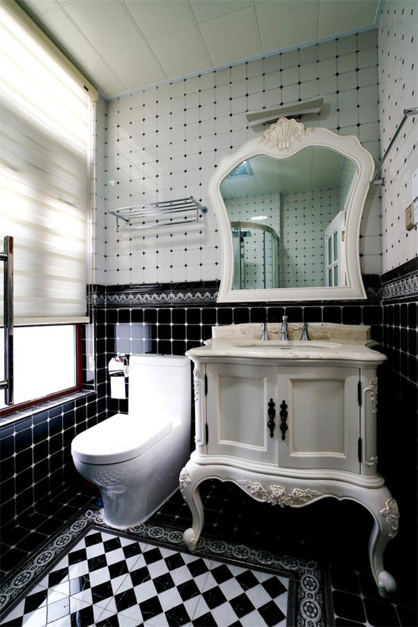 黑白色磁砖拼接出简明时尚的卫浴空间,搭配欧式浴室柜的精致雕花和圆润线条,为冷硬的空间注入一股优雅和柔情。