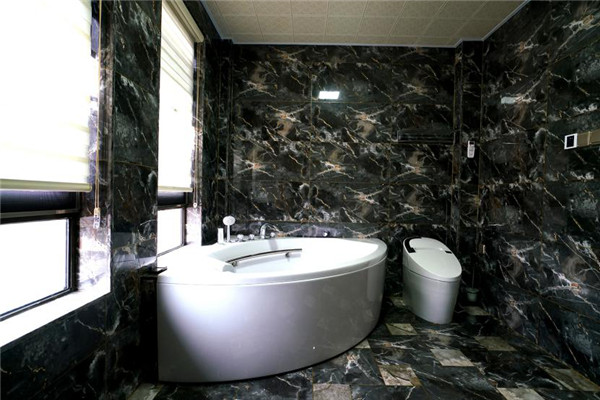 柔美的弧形大浴缸、深灰色花纹的大理石墙面,完美融合轻盈与厚重。