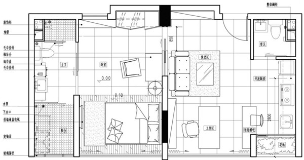 客餐厨、工作区开放式设计,以生活动线分区各个功能空间,让布局不显凌乱又保持了空间的通透。