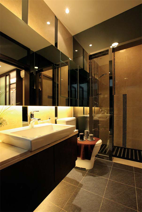 定做浴室镜隐藏收纳功能,保持卫浴简约美观同时充分满足收纳需求,境下暗藏灯管,灯管的聚光功能与顶面散光的射灯纵向延伸立体空间,使得整个空间明亮、宽敞。