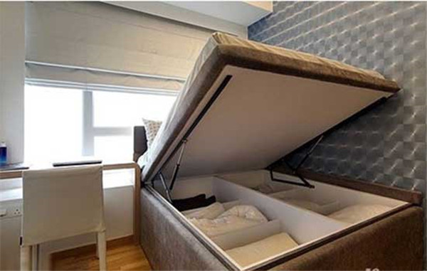 床底收纳也能玩出花样。气动式收纳床让家庭主妇也能轻松抬起床板,封闭式的存储空间能够将物品整齐排好,且不易落灰。拉动式抽屉更能将轻薄的被单和其他细碎的东西分门别类放好,找起来更方便快捷。