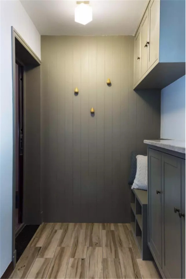 玄关的设置比较全面:墙上水滴状的挂钩、灰绿色的换鞋凳、壁柜等,满足了由户外到室内过渡的所有功能 。地面铺贴的木地板与墙面的木板缝相统一,都是竖向,视觉上拉伸了空间。田字型的换鞋凳简练富有美感,同时还可以用来放置鞋具,提供收纳空间。一旁的壁柜则将房君的视线引入客厅。