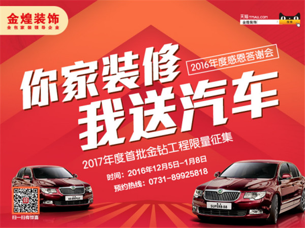 还有一拨福利滚滚而来~~~12月6日~1月8日,金煌装饰2016岁末感恩装修盛典面向全国钜惠征集2017年度首批金钻工程——120平米139800元软硬装全包,千万装修回馈,全房顶级建材免费上级,品牌家电套组、精美家私赠送,优秀设计施工团队诚意打造,全方位升级家居品质。更有豪华大礼——大众斯柯达汽车、iphone7、情侣钻戒等你来领~~~