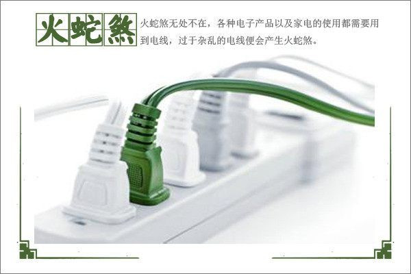 电线由于其形态彷如一条蛇,所以其产生的煞气称为“火蛇煞”。火蛇煞这种风水问题容易造成个人疲劳,神经紧张,甚至肌肉抽搐,筋骨常处于热毒、硬化、酸痛的状态。随着各种电子、家电越来越多,这种病在近年愈来愈普遍。中医所谓“生蛇”,其实也是与家中的电线风水有关系。大量电线在家中不规则地出现,严重影响风水,间接性影响健康。